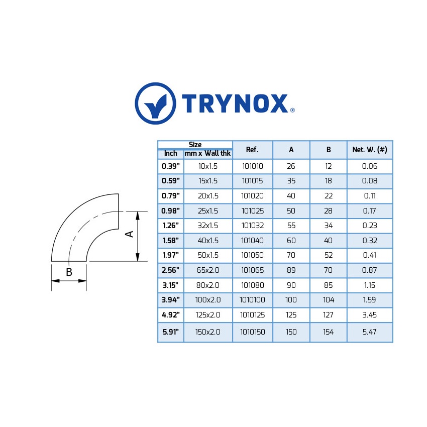 Este codo sanitario está diseñado bajo las normas DIN para la industria de conexiones sanitarias en acero inoxidable. Este codo sanitario cumple o excede los requerimientos de estas normas. Además de la certificación DIN, el material de este codo tiene un contenido de carbono menor al de otros aceros inoxidables lo que minimiza la precipitación de escorias durante el proceso de soldadura. Si las normas DIN son una prioridad en su aplicación sanitaria, entonces usted estará en buenas manos con Chemseal y su línea de conexiones, tuberías y válvulas fabricadas por Trynox.