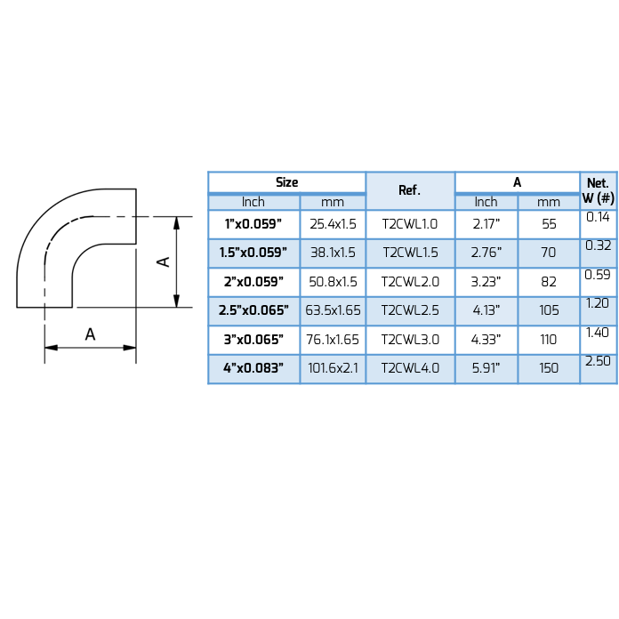 * Codo Sanitario 90° SMS con Recto para soldar de la serie T2CWL de Trynox®