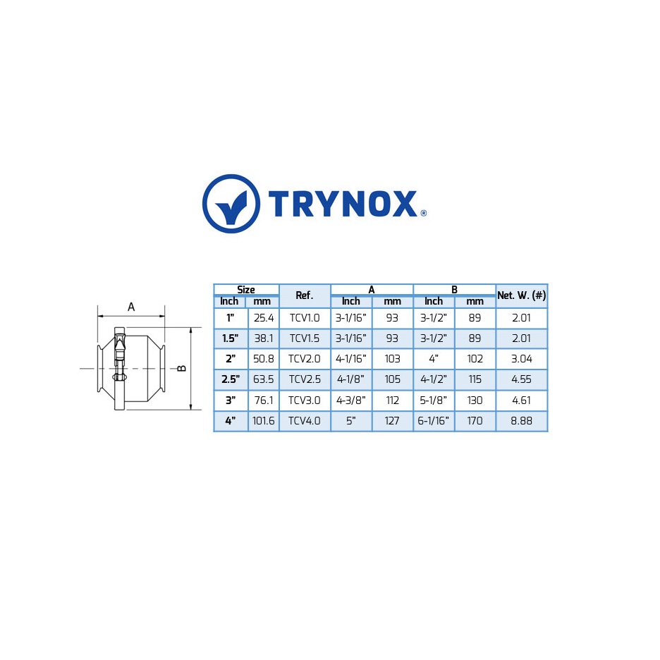 Con la garantía de calidad Chemseal para nuestras conexiones sanitarias y otros artículos en acero inoxidable, puede confiar en el rendimiento de la Válvula Sanitaria Check con conexiones Clamp de Trynox. Confíe en Chemseal, la empresa de tuberías, conexiones y accesorios sanitarios de mayor calidad del mercado. Considere que esta válvula viene con sello de EPDM como estándar, si desea otra opción simplemente háganoslo saber cuando solicite su cotización. No se conforme con menos, en el mercado de soluciones integrales Chemseal le ofrece sus artículos sanitarios para un óptimo rendimiento y control de su proceso sanitario.